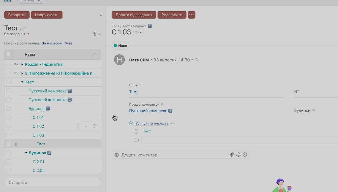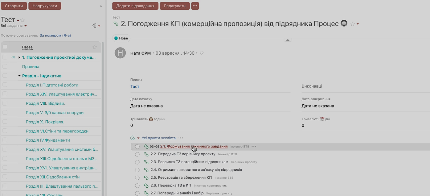 Створення завдань у системі максимально просте. У секції достатньо вписати значення в чек-лист і натиснути «Enter» — одразу формується завдання з повною вкладеністю.