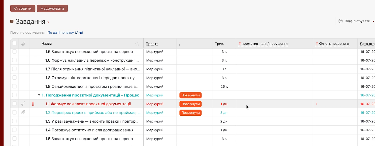 Якщо завдання протерміноване, система показує, на скільки днів перевищено плановий норматив.