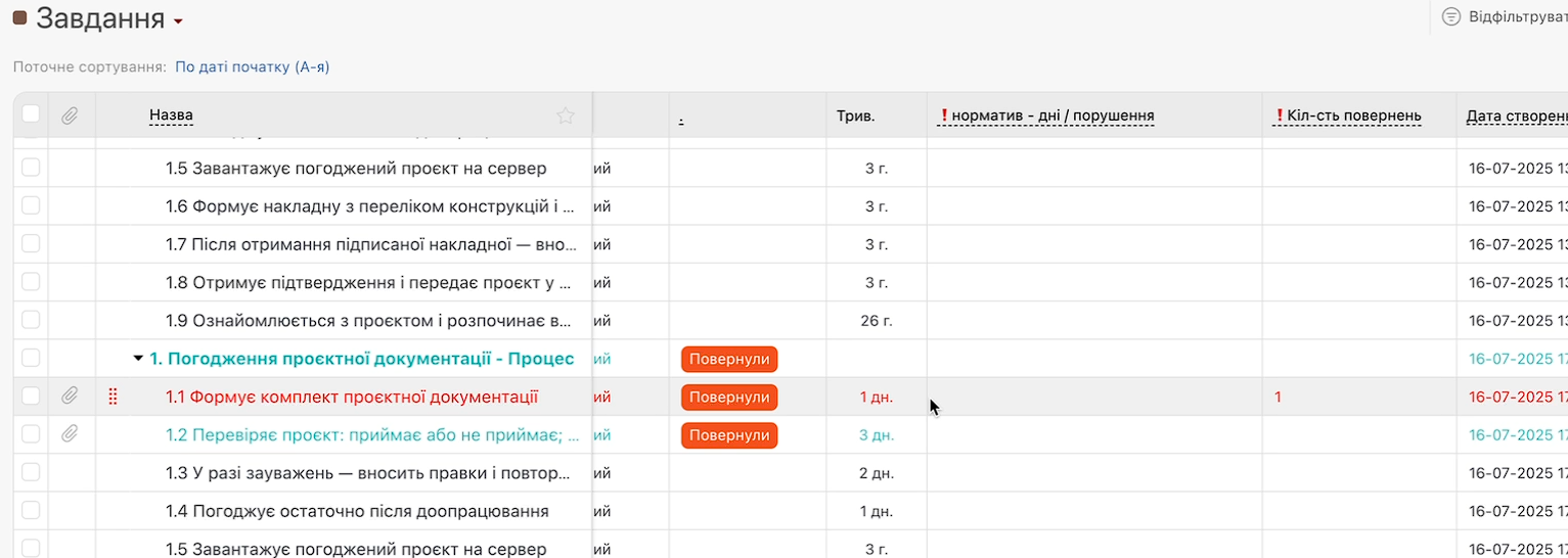 У будівельних проєктах критично важливо контролювати строки. Для цього ми налаштували поле «Норматив — дні / порушення».