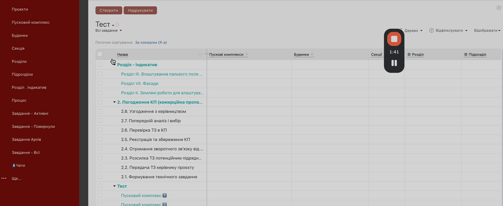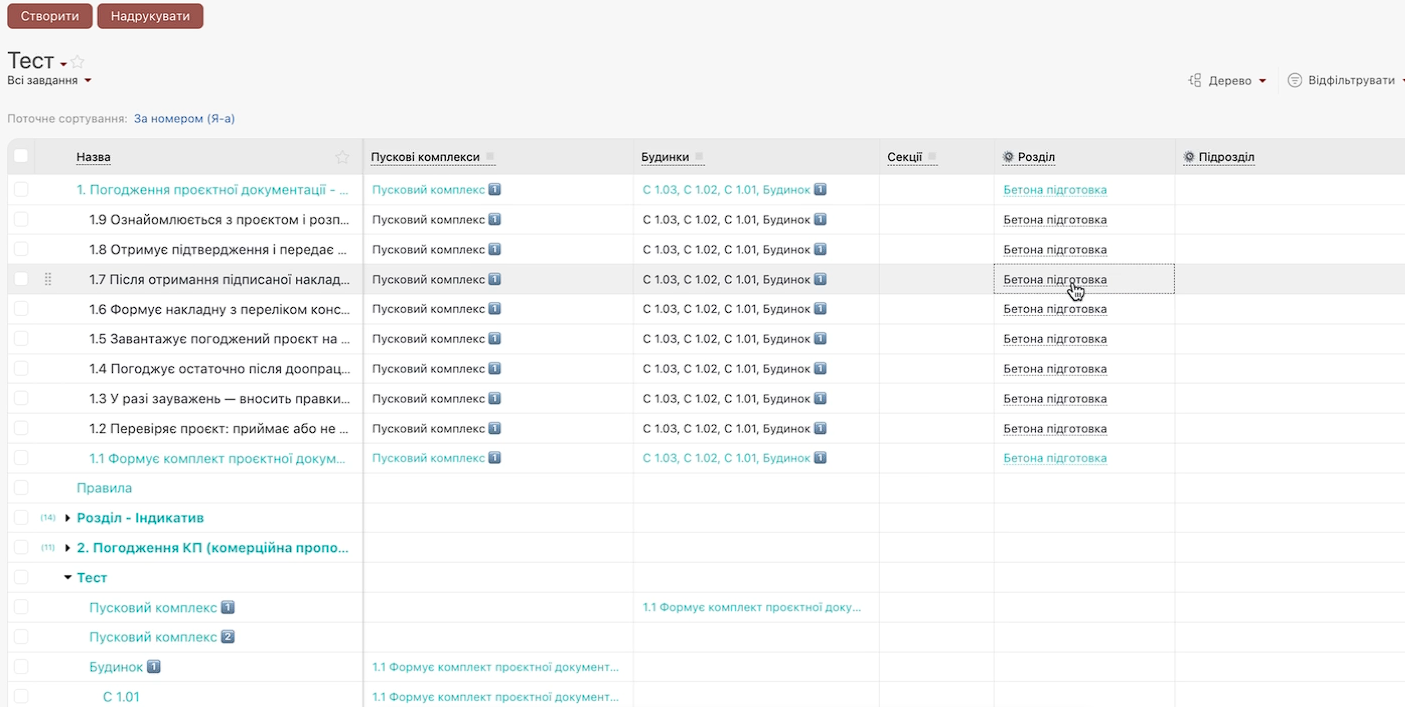 Проєкти → Пускові комплекси → Будинки → Секції → Розділи → Підрозділи.