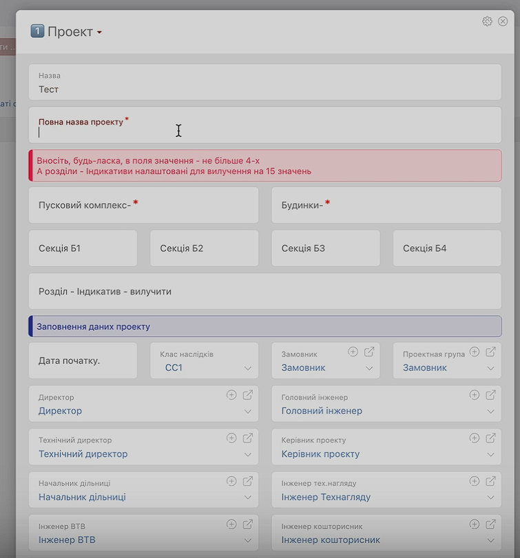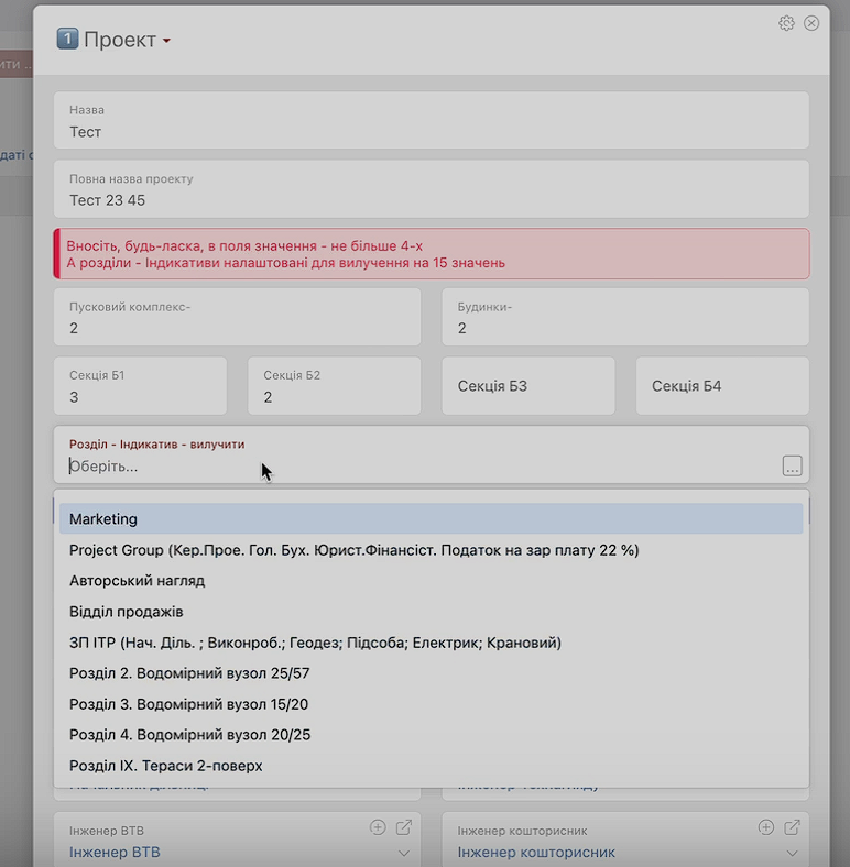 Система автоматично підтягує параметри: будинок, секцію, ПК, розділ індикатив. Усе залежить від тієї сутності, яку ми створюємо. Завдяки цьому менеджерам не потрібно вручну вносити дані — вкладеність формується автоматично.