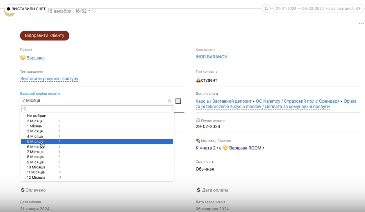 Задачей CRM на этом этапе стало построить управляемую систему сбора показателей, контроля сроков и автоматического выставления счетов, без ручного контроля со стороны менеджеров.