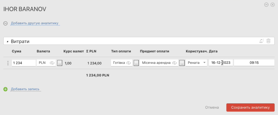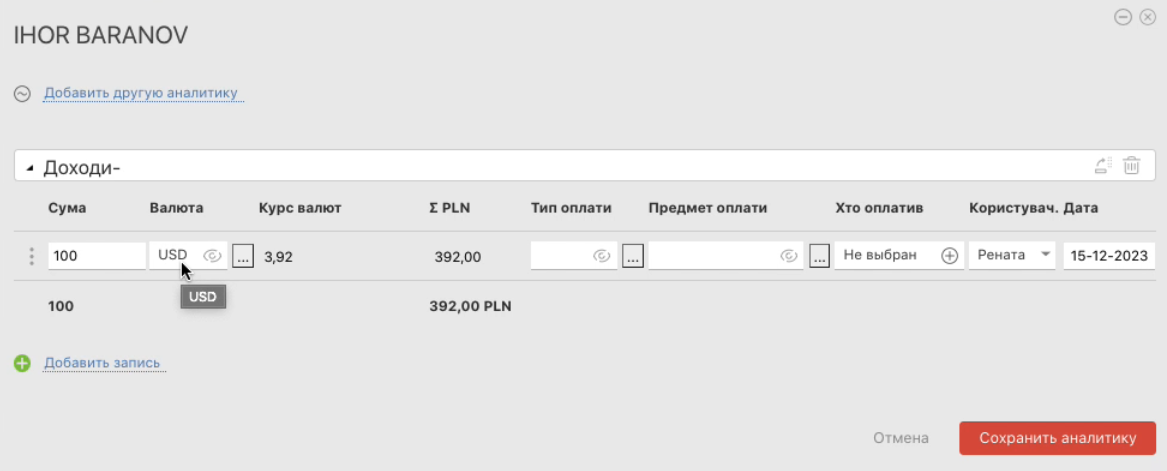 Оплата может добавляться автоматически и вручную с выбором валюты и курса.
