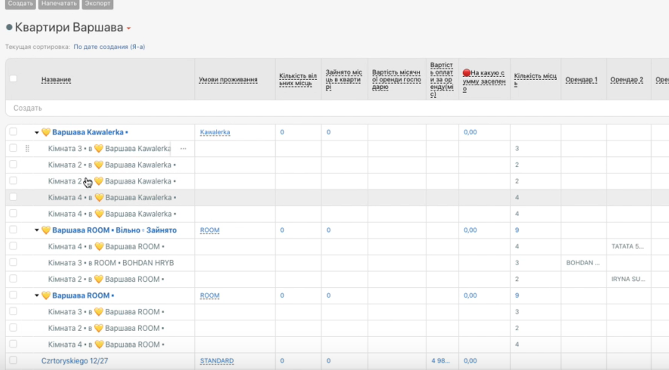 Заполнение квартир арендаторами происходит исключительно через комнаты. Именно это обеспечивает корректную логику занятости и расчётов.