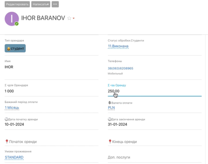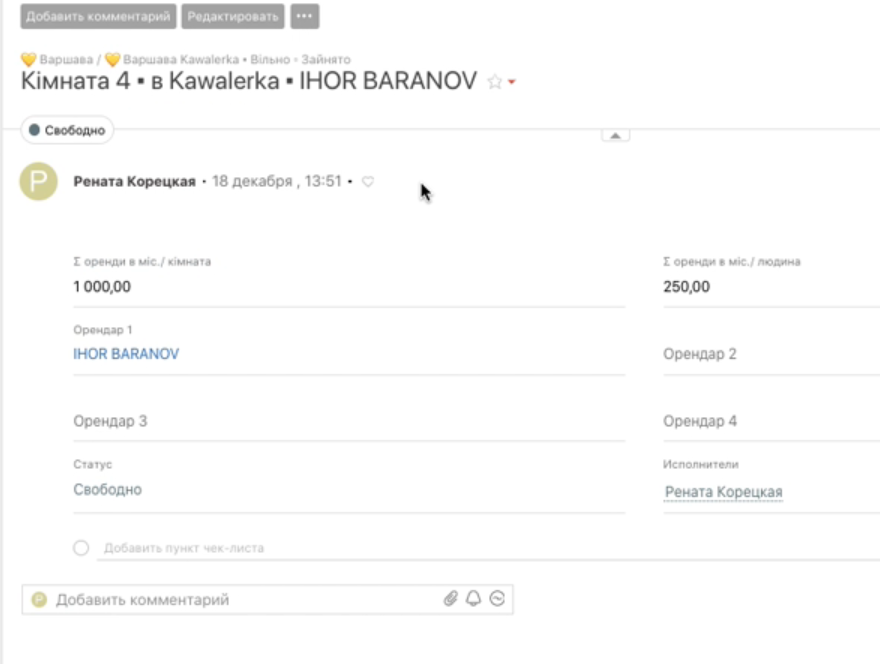 CRM контролирует заполнение комнаты: когда фактическое количество жильцов равно плановому, комната автоматически переходит в статус «Занято». Если количество уменьшается — статус возвращается на «Свободно».