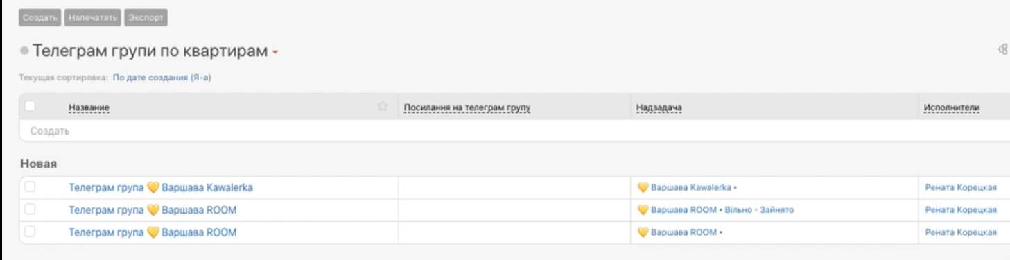 Для каждой квартиры CRM автоматически создаёт отдельную Telegram-группу, которая логически соответствует одному объекту аренды.