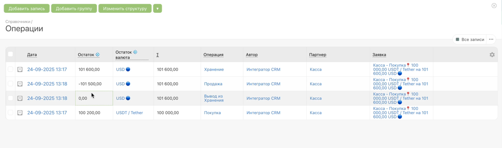 CRM автоматически проводит вторую операцию — вывод из хранения. На табло остаток обновляется, а в колонке «Хранение» отображается «0».