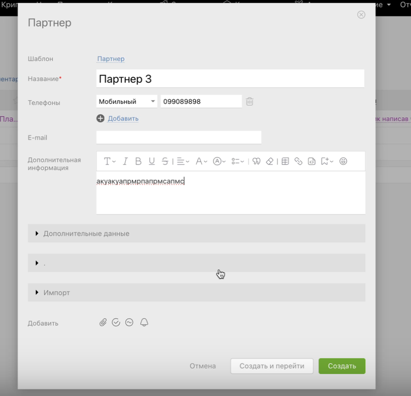 Менеджер создает партнёра через кнопку «+ Партнёр», заполняет основные поля (имя, номер телефона, email, Telegram, WhatsApp и т.д.) и нажимает «Создать и перейти».