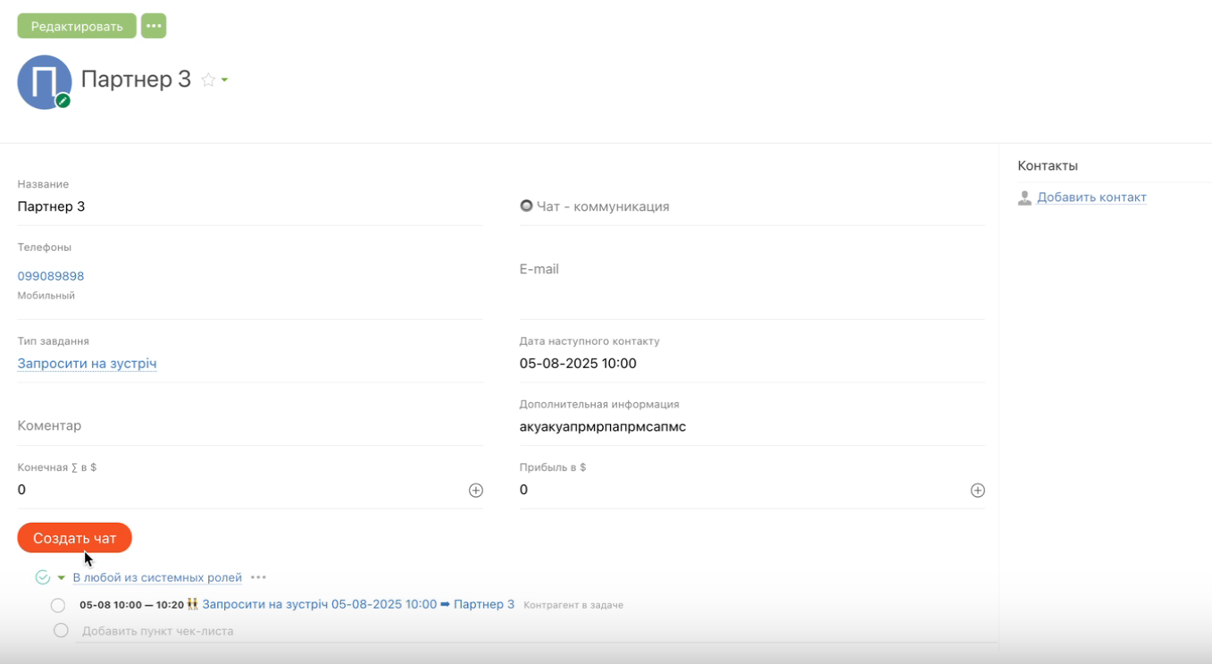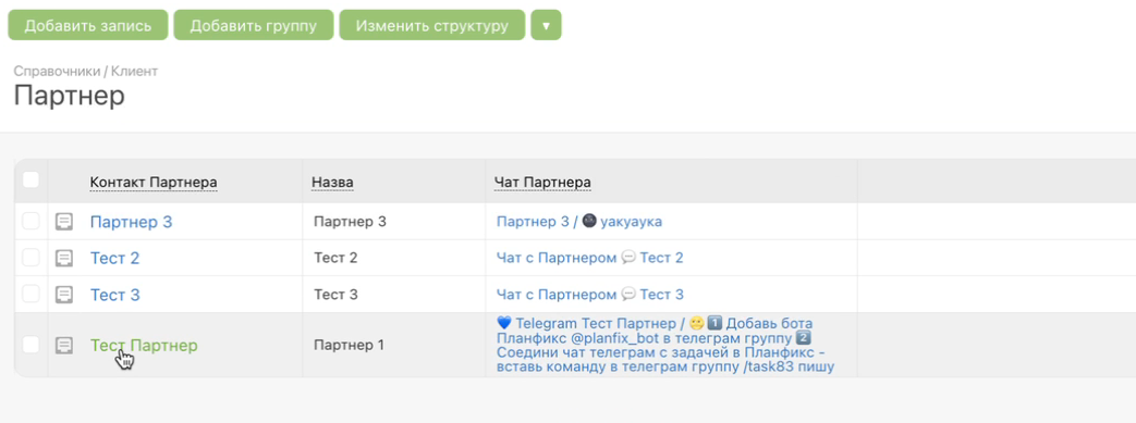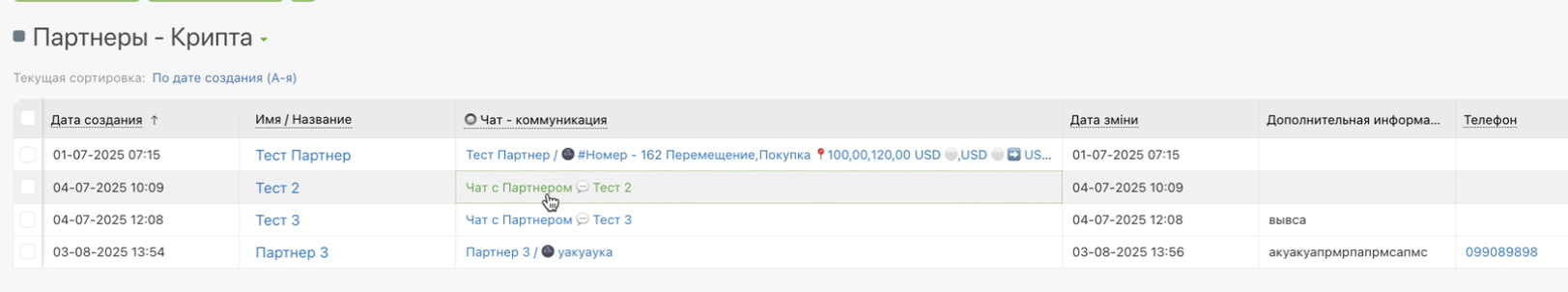 В системе предусмотрено автоматическое создание Telegram-чата для каждого партнёра: