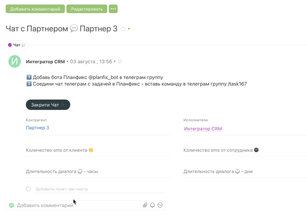 Для упрощения и ускорения взаимодействия между компанией и партнёрами CRM-система интегрирована с Telegram.