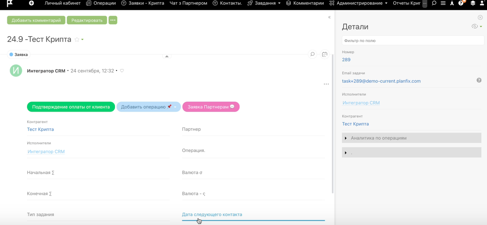 При создании заявки система автоматически формирует карточку контакта, фиксирует менеджера, исполнителя и дату следующего взаимодействия.