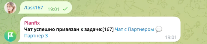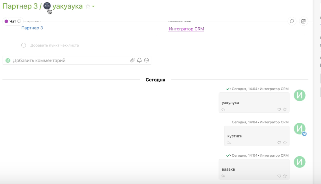 Если партнёр отвечает на это сообщение в Telegram, его ответ попадает прямо в чат той же сделки в CRM.
