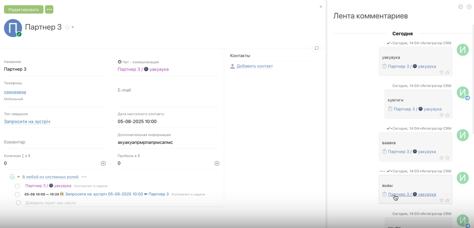 Все сообщения попадают в ленту комментариев справа в карточке партнёра.
