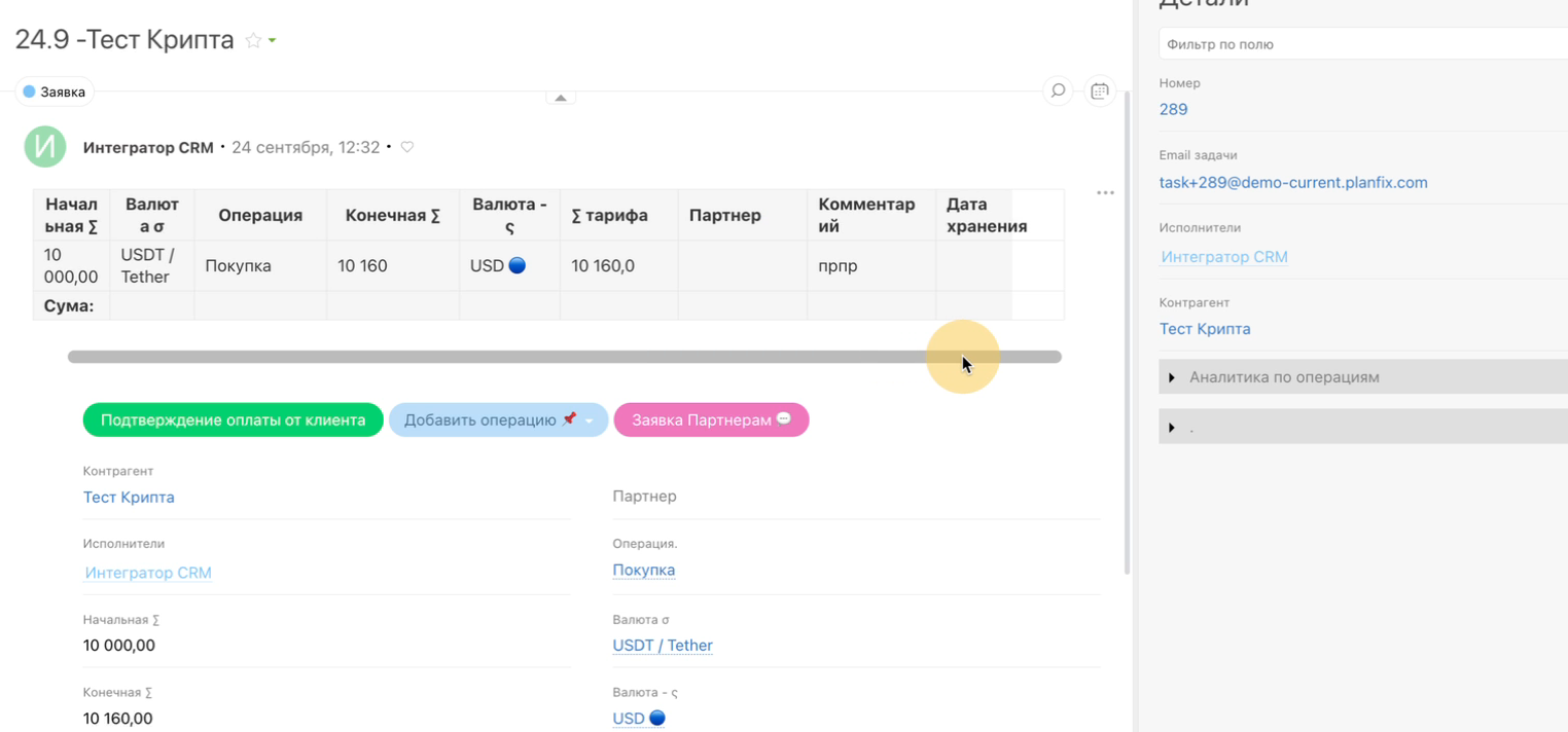 После подтверждения сделки средства зачисляются на баланс компании и отображаются в системе как «на хранении». В аналитике клиента отображаются сумма, валюта, дата и статус операции. На табло эта сумма отображается в отдельной колонке «Хранение».