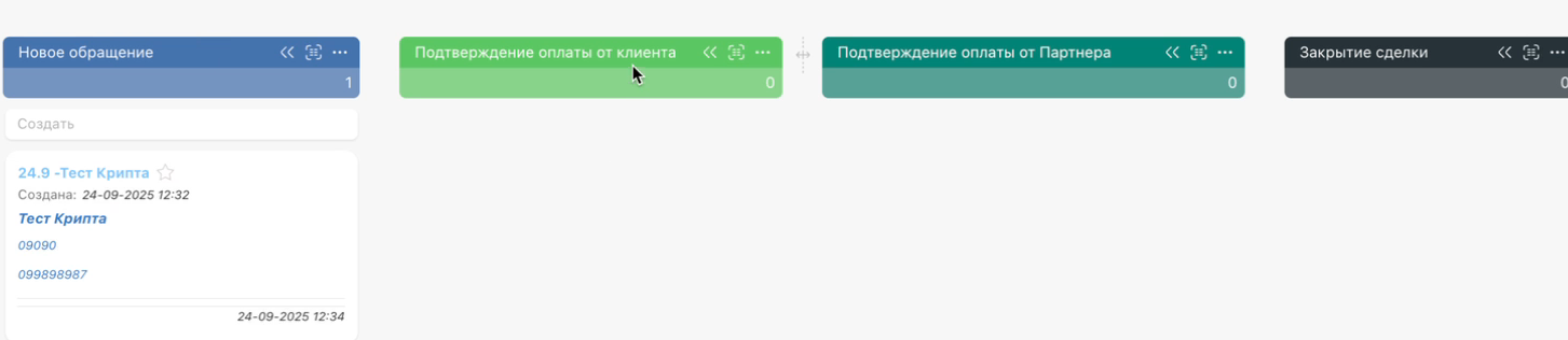«Новое обращение» → «Подтверждение оплаты клиента» → «Подтверждение оплаты партнёра» → «Закрытие сделки».
